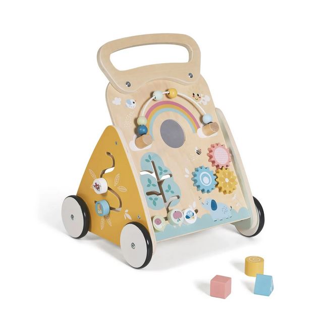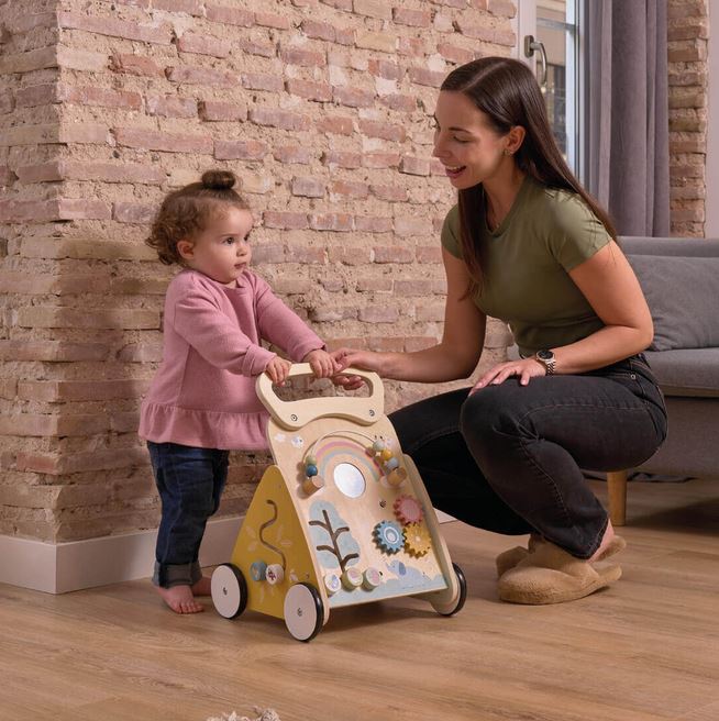Watch your little ones take their first precious steps with this fantastic walker and activity center. With textured wheels easy grip handle and a durable design, the sturdy walker gives all the support they need to take their first steps. The fun-filled activity panel can be used for extra sit-down play! Includes lots of exciting activities cheerful music and friendly phases.